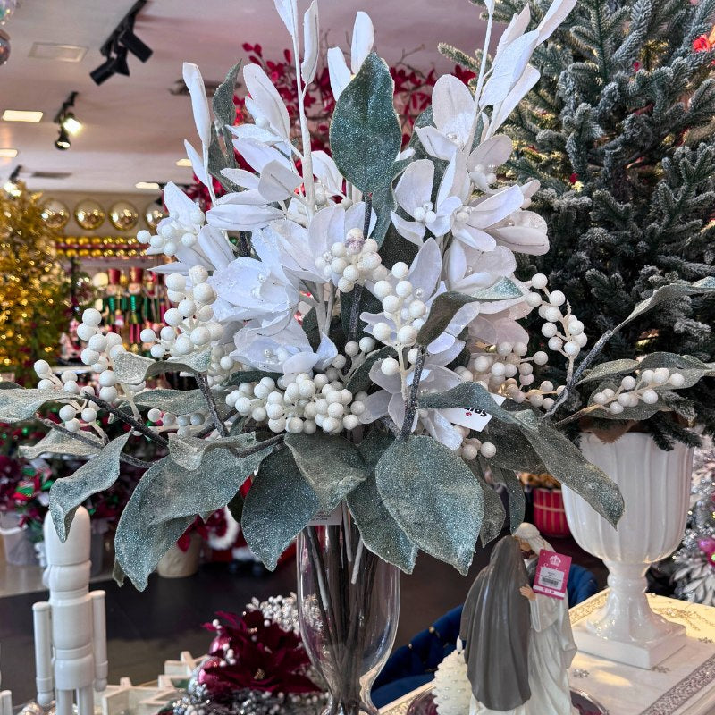 Rama De Navidad Hojas Nevadas Brillantes de Bayas Blancas 80 CM